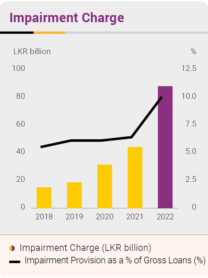 Asset quality was a primary point of focus during the year, as deterioration of asset quality was noticeable across the industry due to slow down in the economy. The Bank’s Stage 3 loans and advances amount also increased by 29% to LKR 324.9 billion. The Bank exercised stringent measures to monitor and moderate the risks and took a proactive approach by making a significant impairment provision during the year. The Bank’s impairment provision almost doubled in 2022 due to significant increase in credit risk. Exposure to customers in elevated risk industries remains a concern, as does exposure to Government in the form of investment and lending to state-owned enterprises. Multiple years of economic stress and the Government’s defaulting or delaying in honouring of commitments contribute significantly for impairment provisioning in 2022.