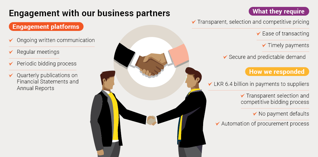 As a key player in the financial services sector, Bank of Ceylon supports suppliers and partners to comply with procurement practices and regulations, and prioritises procurement from local suppliers in order to contribute to the development of the supply chain. The Bank ensures timely payments are carried out, and continues to look for ways of reducing payment times and improving convenience for suppliers and business partners.