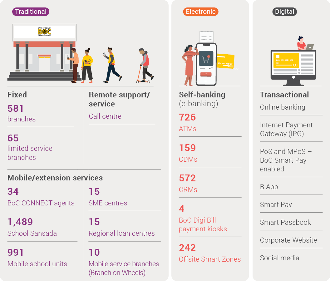 BoC serves all segments of society and reaches customers from all walks of life through the Country’s widest branch network and physical presence, a rich and diverse product-mix, and a rapidly expanding digital footprint. Fuelling economic activity through access to financial services, nurturing a savings culture, and reaching the underserved and underrepresented are essential components of the Bank’s mandate.