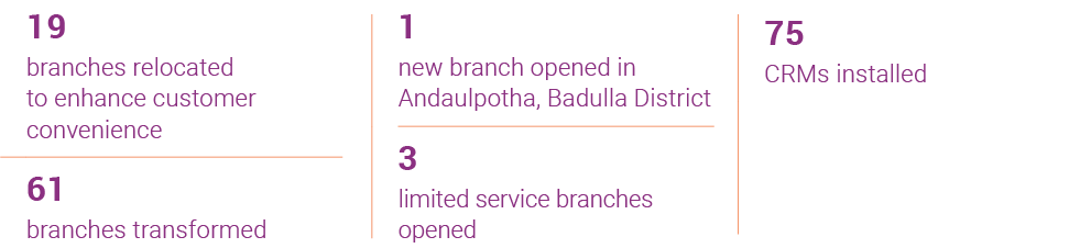 Continuous investment in physical and digital infrastructure increases accessibility for customers, while also contributing to customer convenience and overall customer experience. During 2022, the Bank made several enhancements to branches, opened a new branch in the Uva Province, expanded the network of Cash Recycling Machines (CRMs) to key institutions such as hospitals, educational institutions, airports, railways, and tourist attractions.