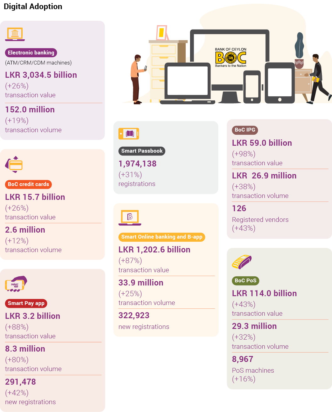 Bank of Ceylon recognises the crucial role of digitalisation in meeting the modern demands of the banking sector whilst enhancing customer experience and ease of banking. As such, Digital Excellence is a cornerstone of the Bank’s strategy for medium to long-term sustainability. The Bank continues to invest in digital infrastructure and solutions that cater to the diverse needs of its customers. As a result, there has been significant adoption of digital channels resulting in 48% of all customer transactions occurring through digital or electronic banking channels in 2022.